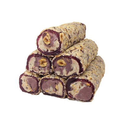Home » Turkish Food » Turkish Delight » Hazelnut Coated Turkish Delight with Hazelnut and Blackberry Cream Filling