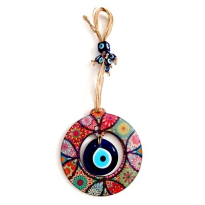 Grandbazaarist Wooden Mandala Patterned Handmade Wall Ornament with Glass Evil Eye Beads in the Middle